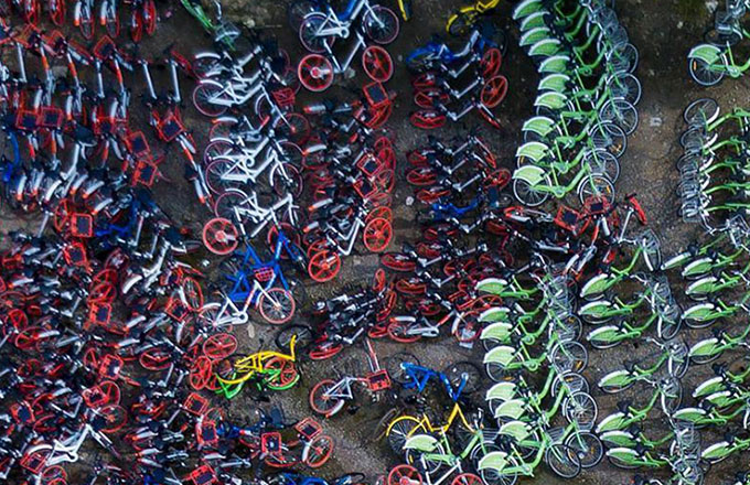 Aerial photo shows various sharing bikes lined up at a parking area in Nanjing, May 5, 2017. The bike-sharing business, which took off in major Chinese cities less than two years ago, has seen a growing number of shared bikes from different companies. [Photo/Chinesenews.com]
