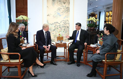 Chinese President Xi Jinping and his wife Peng Liyuan accompany visiting US President Donald Trump and his wife Melania on a tour in Beijing's Palace Museum, Nov 8, 2017.