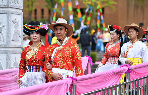 Ninety-nine newlyweds wearing traditional clothes of Mosuo people attended a group wedding ceremony.