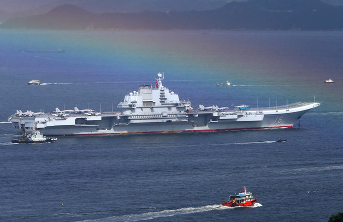 Vice Commander of the People's Liberation Army Navy and Commander of the aircraft carrier formation Ding Yi (L) and Chief Executive of Hong Kong Special Administrative Region (HKSAR) Lam Cheng Yuet-ngor cut a cake during a deck reception on Chinese aircraft carrier Liaoning in Hong Kong, south China, July 7, 2017.