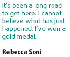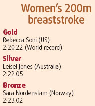 Jones was out front over the first 100, but Soni came on strong at the end, finishing a full body length ahead of the Australian in 2:20.22, which bested Jones' two-year-old world mark. "It's been a long road to get here. I cannot believe what has just happened. I've won a gold medal," said the fresh-faced 21-year-old. Soni, who captured the silver in the 100 breaststroke, was not an original selection for the US swim team. She was replacement for Jessica Hardy, who had failed a doping test. She made light of her astonishing progress since the surgery: "It was a small heart procedure to take care of things and get back in training."