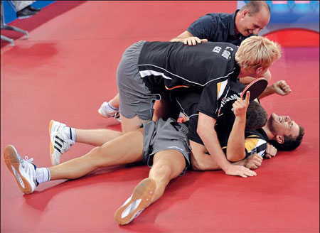 Star-studded China whitewashed South Korea 3-0 to storm into the table tennis team finals yesterday. It will now play Germany. The mighty trio of Ma Lin, Wang Hao, Wang Liqin finished the best-of-five matches in less than two hours. Four-time World Cup winner Ma Lin had the toughest match, the opener. He needed five games to get past 15th-ranked Oh Sang-eun 8-11, 11-7, 12-10, 11-13, 5-11. World No 1 Wang Hao then displayed great skill to defeat reigning Olympic champion Ryu Seung-min 11-7, 6-11, 11-9, 11-6. In the Athens Games, Ryu Seung-min had beaten Wang Hao to clinch the singles gold. Wang Liqin and Wang Hao then blasted Yoon Jae-young and Oh Sang-eun 11-4, 11-6, 11-5 to give China the deciding win. Germany 3 Japan 2 Germany barely held off a determined Japanese to advance to the gold-medal match. "We have nothing to lose. The Chinese have the pressure," Germany's Christian Suss said. "China has to win the gold medal in their own country here." Led by Timo Boll, the sixth-ranked player in the world, the Germans were on the offensive for the majority of the contest, driving to the sides and corners of the table and making the Japanese chase the ball. But the unflashy Japanese waited for the Germans to make mistakes and mixed in a few of their own searing shots to force a decisive fifth game in three of the matches. The deciding match pitted Boll against No 63 Seiya Kishikawa, whose misfired returns were a big factor in the German victory. Boll had a shiny sheen of sweat on his forehead apparently more related to nerves than exertion. Agencies (China Daily 08/17/2008 page5) |
