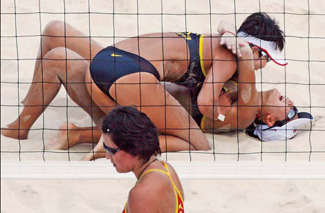 Wang Jie and Tian Jia made history yesterday as they became the first China pair to reach the women's beach volleyball final. They overcame teammates Xue Chen and Zhang Xi in three sets, 22-24, 29-27 and 15-8, to set up a final tomorrow with hot favorites Kerri Walsh and Misty May-Treanor, the defending Olympic champions. Wang, 24, said the result was a major landmark for China in the sport. "No matter who won the match today, it is a breakthrough for beach volleyball for China, and the honor always belongs to our country," she said. Tian, 27, added: "Both the sides played to our best standards in the match. "I hope both our teams perform well in the next matches." Wang, however, said she has no illusions that tomorrow's match will be easy for the home side. "Our opponents are the strongest team, so they should feel more nervous than we do. We will start as the underdogs," she said. Walsh and May-Treanor's 21-12 and 21-14 win over Brazil's Talita Antunes and Renata Ribeiro was their 107th consecutive victory. May-Treanor says the Athens win four years ago is also a major motivation and that the pair's game had also improved. "I always relive it over and over. Even though it was four years ago, it still feels like I'm there," she said. Agencies (China Daily 08/20/2008 page15) |