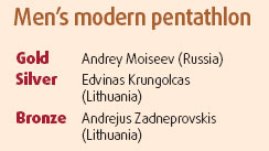 Moiseev led after the first four events - shooting, fencing, swimming and equestrian. That meant he was allowed to start the 3,000m run 13 seconds ahead of the field yesterday. Moiseev won by 21 seconds. Edvinas Krungolcas won the silver, and Andrejus Zadneprovskis took the bronze. Moiseev won the gold medal with a total 5,632 points. The Russian had a 84-point advantage over second place finishers Krungolcas and another 24 over Zadneprovskis. The 29-year-old Russian, who is also a three-time world champion, managed only to win the fencing section of the competition, but was strong enough in the other disciplines to deny the two Lithuanians the gold medal. Krungolcas, who twice won the world championships, but finished just 31st in Athens, needed to make up too much ground in the final 3,000m cross country race to be able to snatch the gold medal away from Moiseev.