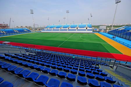The stand and the field of the Olympic Green Hockey Field in the south of the Olympic Park is seen in this picture taken on May 16, 2008. This Field will host the hockey games of the Olympics and the soccer games of the Paralympics. [Xinhua]