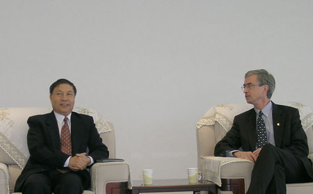 Yu Xiaoxuan (L), deputy director of BOCOG Construction and Environment Department meets with Director-General of the World Wildlife Fund (WWF) James P. Leape October 23,2006.[BOCOG] |
