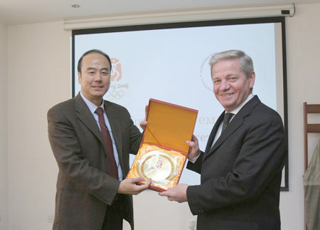 Wang Wei, executive vice president and secretary-general of the Beijing Organizing Committee for the Games of the XXIX Olympiad (BOCOG) presents a souvenir to visiting delegation of the Russian Olympic Committee headed by vice president Vladimir Vasin October 27,2006.[BOCOG] |
