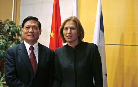 Israeli Foreign Minister Tzipi Livni (R) meets with Liu Qi, president of the Beijing Organizing Committee for the 2008 Olympic Games (BOCOG), in Jerusalem November 22, 2006.[Reuters] |