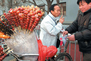 Wang Tao(left) persuades a peddler not to spit and invites him to be a volunteer urging customers not to spit on the street. [China Daily]