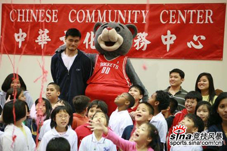 NBA Rocket centre Yao Ming of China posed for photos with children from the Chinese Community Center in Houston on Tuesday, February 13, 2007. NBA star Yao Ming of China visited the Chinese Community Center and talked with about 100 children about the Chinese lunar New Year.[sports.sina.com.cn]