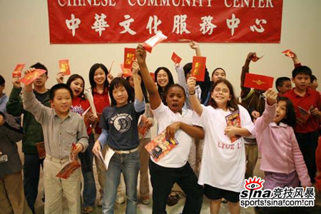 Pupils jumps to show their Lunar New Year red pockets given by NBA Rocket centre Yao Ming of China at Chinese Community Center in Houston on Tuesday, February 13, 2007. NBA star Yao Ming of China visited the Chinese Community Center and talked with about 100 children about the Chinese lunar New Year.[sina.com.cn]