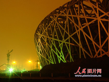 The nightview of the construction site for the National Olympic Stadium, also known as the "Bird's Nest", in Beijing after Spring Festival holiday.[photobase.cn]