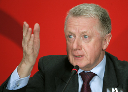Chief International Olympic Committee (IOC) inspector Hein Verbruggen gestures at a news conference in Beijing April 19, 2007. Beijing organisers still believe a solution is possible to the problem of taking the 2008 Beijing Olympic torch relay to Taiwan, an official said on Thursday. [Reuters]