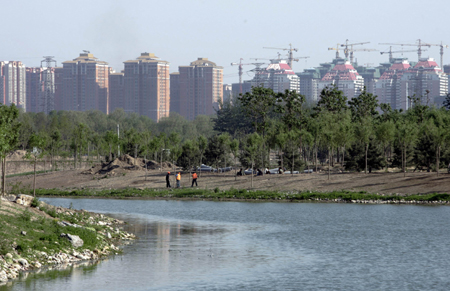 Workers plant trees near a river inside the Olympic Park, which is under construction, in Beijing May 9, 2007. [Reuters]