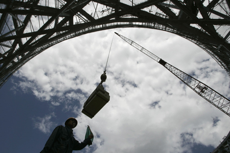 A labourer works inside the National Olympic Stadium, also known as the "Bird's Nest", which is still under construction in Beijing May 17, 2007. China has pulled out all the stops in its attempts to curb pollution and Olympic officials are confident air quality will be good come the 2008 Games. [Reuters]