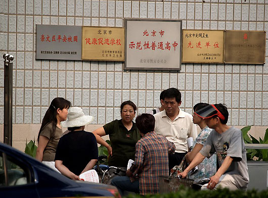Parents waiting outside talk with each other -- by Zou Lao in June of 2007.