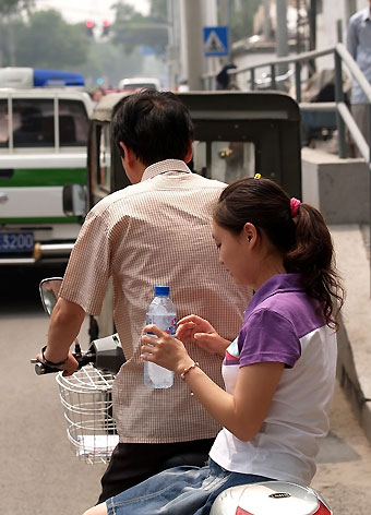 A student is taken home after completing first exam - - by Zou Lao in June of 2007.