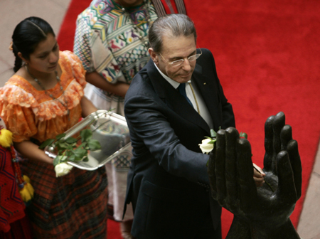 International Olympic Committee (IOC) President Jacques Rogge (R) takes part in the "Changing of the Rose" ceremony at the National Presidential Palace in Guatemala City July 3, 2007. The ceremony is a symbolic gesture of peace. The IOC has shortlisted Sochi, Salzburg in Austria and Pyeongchang in South Korea to host the 2014 Winter Olympics and will announce the winner on Wednesday in Guatemala. [Reuters] |