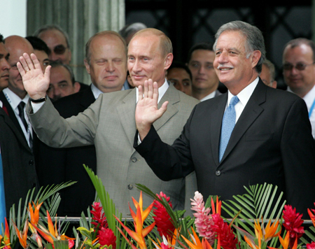 Russia's President Vladimir Putin and Guatemala's President Oscar Berger (R) wave during a meeting at the Presidential Palace in Guatemala City July 3, 2007. Putin is supporting the bid of Russian city Sochi to host the 2014 Winter Olympics at the 119th International Olympic Committee session in Guatemala. Austria's Salzburg and South Korea's Pyeongchang are also in the running. The winner will be announced on Wednesday. [Reuters] |
