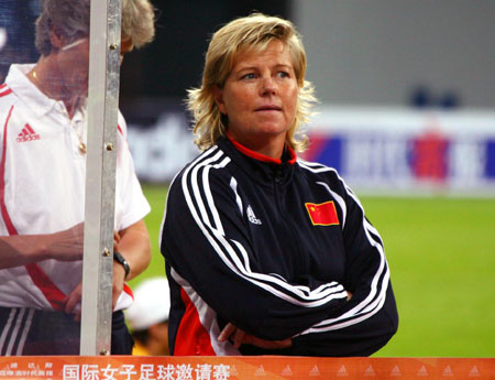 Marika Domanski-Lyfors, head coach of China's women soccer team watches his side playing against Mexico at the final game of the four-nation invitational tournament in Shenyang Stadium, the Beijing Olympic Games test-venue event July 10, 2007. China won the title with a last-minute goal from Xie Caixia. [Xinhua]