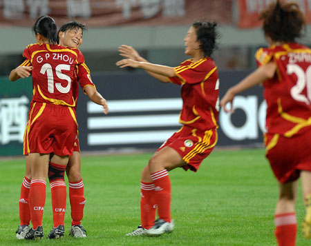 Xie Caixia, (second left) celebrates with her teammates after scoring the game winning goal in the four-nation invitational tournament final game in Shenyang Stadium, the Beijing Olympic Games test-venue event July 10, 2007. [Xinhua]