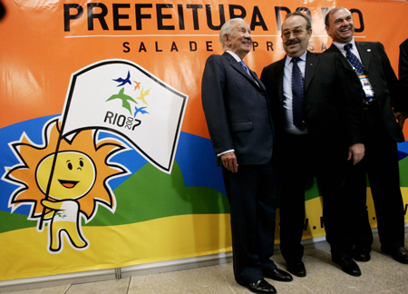 President of the Pan-American Sports Organization Mario Vazquez Rana (C) tours the facilities at the Pan American Games media center with the Mayor of Rio de Janeiro Cesar Maia (R) and former International Olympic Committee's (IOC) President Juan Antonio Samaranch in Rio de Janeiro July 12, 2007. Brazil will host the Pan American Games from July 13 to 29.[Reuters]