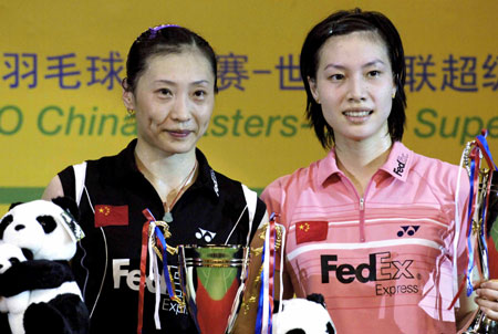 Xie Xingfang (R) China's world number two and winner of the women's singes of the China Masters Badminton tournament and Zhang Ning world number one and runner-up of the game pose on the podium in Chengdu on Sunday. [Xinhua]
