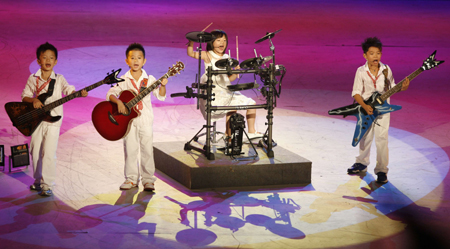 Members of rock band 20088 Libo Chen (bass), Zhang Yi Han (guitar), Guo Xin Yue (drums) and Jing Sheng Hao (guitar) (L-R) perform during the closing ceremony for the Olympic culture festival in Beijing July 15, 2007. The band's manager claims 20088, whose members are seven-years-old, to be the youngest professional rock band in China. The band has performed in some Olympic related events as all of the members will reach the lucky age of eight in 2008, the year of the Beijing Olympics. [Reuters] |