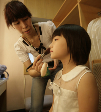 Guo Xin Yue, drummer of rock band 20088, gets her make-up backstage before they perform at the closing ceremony for the Olympic culture festival in Beijing July 15, 2007. The band's manager claims 20088, whose members are seven-years-old, to be the youngest professional rock band in China. The band has performed in some Olympic related events as all of the members will reach the lucky age of eight in 2008, the year of the Beijing Olympics. [Reuters] |