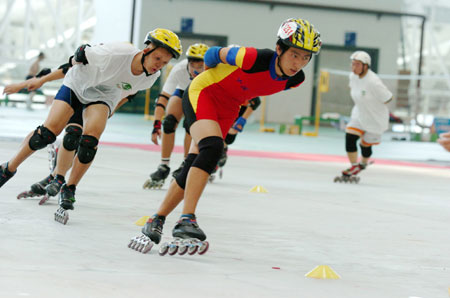 Chinese national special roller skating team members trains in Hei Longjiang of Northeast China July 16, 2007. [Xinhua]
