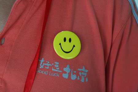 A volunteer shows his volunteer logo,a smiling face at Shenyang Olympic Centre ahead of the final match between Chinese women soccer team and their Italy counterpart at the four-nation invitational tournament, or one of the "Good Luck Beijing"Olympic test events, in Shenyang,northeast China's Liaoning Province.[chinadaily.com.cn]