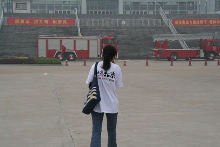 A volunteer walks out of the Qinghuangdao Olympic Center ahead of soccer matches at four-nation invitational tournament, or one of the "Good Luck Beijing"Olympic test events, in Qinhuangdao,a coastal city of north China's Hebei Province.[chinadaily.com.cn]