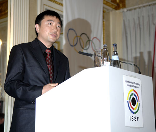 Double Olympic gold medal winner Yang Ling (L) speaks during the awarding ceremony of "Honorary Shooting Champion" voted by the International Shooting Sport Federation (ISSF) in Munich of Germany July 17, 2007. Yang and Veteran shooter Wang Yifu from China were awarded with honor. [Xinhua]