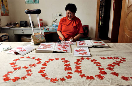 Lu Mengdie, a disabled youth of Northwest China's Ningxia Hui Autonomous Region does paper cutting in her home July 19, 2007. Lu spent a year cutting 2008 paper butterflies to give best wishes to the Beijing Olympics. [Xinhua]