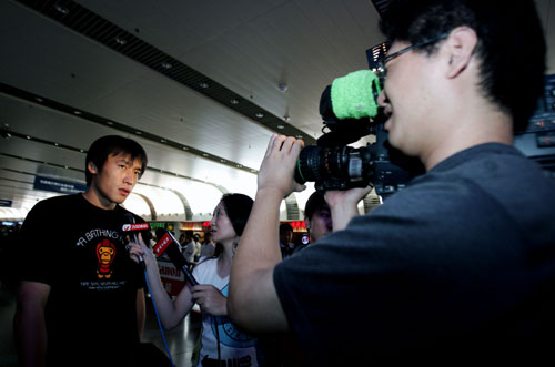 Chinese footballer Du Wei arrives at Beijing Capital International Airport after competing in Asian Cup in Kuala Lumpur of Malyasia July 20, 2007. China lost to Iran 3-0 on Wednesday and was eliminated after group stage for the first time in 27 years. [Xinhua]