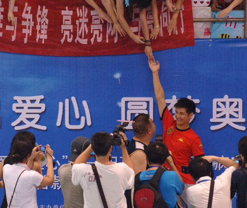 China's "Diving Prince" and former Olympic champion Tian Liang (C) is welcomed by journalists and fans in Xi'an diving stadium of Northwest China July 19, 2007. The retired diver staged a diving performance to finance young congenital heart disease sufferers. [Xinhua]