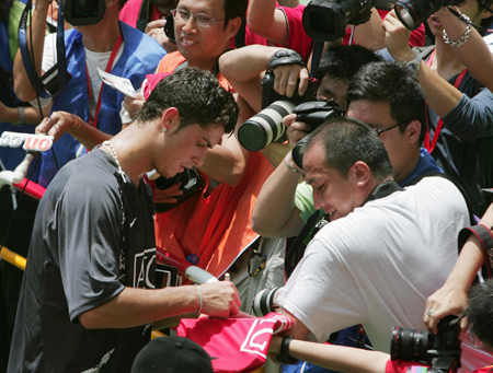 Cristiano Ronaldo of Manchester United signs autographs for journalists after a training session in Macau July 22, 2007. British soccer club Manchester United will play against Shenzhen Xiangxue Eisiti FC in the Chinese gambling enclave on July 23 as part of their Asian tour.[Reuters] |