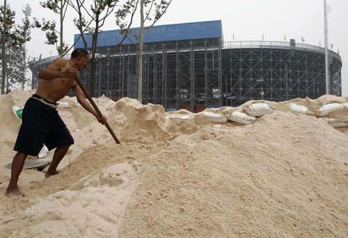 A labourer shovels sand which was transported from south China's Hainan island, in front of the venue for the 2008 Olympics beach volleyball competition at Chaoyang park in Beijing July 26, 2007. Chinese Premier Wen Jiabao has urged developers of 2008 Beijing Olympics stadiums to be energy-efficient and frugal during construction, Xinhua reported. [Reuters]