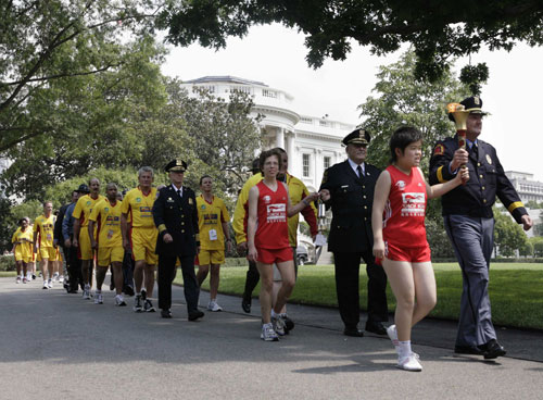 Law enforcement officers and Special Olympics athletes (in red), Oiao Meili of China (2nd R) and Karen Dickerson of the U.S., walk with a Special Olympics torch on the South Lawn of the White House in Washington July 26, 2007 following a global law enforcement run ceremony in the Rose Garden. [Reuters]