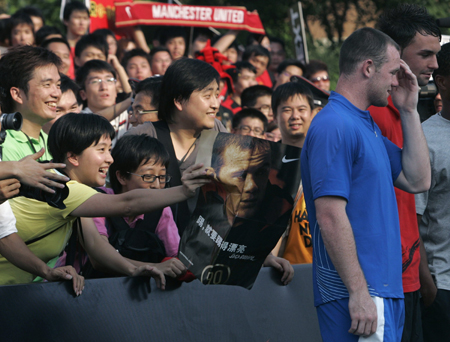 Fans ask Wayne Rooney of Manchester United to sign an autograph during a promotional event of the English soccer team in China's southern city of Guangzhou in Guangdong province July 26, 2007. Manchester United will play against Guangzhou Yi Yao on July 27 in Guangdong Olympic Stadium as the last match of their Asian tour.[Reuters] |