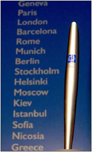 An olive leaf served as the inspiration for the first olympic torch that travelled to all five continents, carrying the message of peace for the Olympic Games of 2004. Its form was drawn from the leaf's lines and its harmonious shape. The torch's design was selected to enhance the flame with its upward dynamic shape. Its ergonomic curved design establishes the torch as the continuation of the flame, which does not only come from the torch, but rises as a continuation of the torchbearer's hand. Weighing 700gr. and standing at 68cm, it is made of metal (magnesium) and wood (olive tree) in their natural colors.