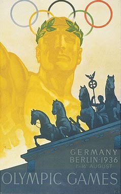 It features the Quadriga from the Brandenburg Gate, a landmark of the city of Berlin. In the background is the figure of a wreathed victor, his arm raised in the Olympic salute, symbolising Olympic sport.