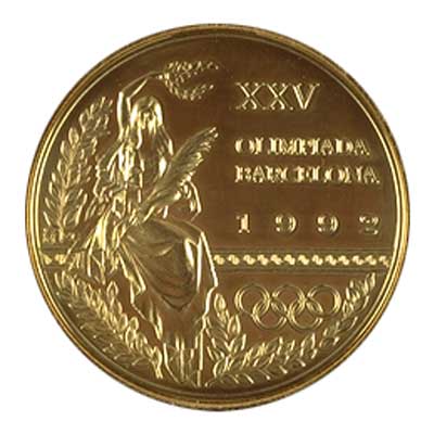 On the obverse, a medallion 56mm in diameter, superimposed on the medal and slightly off-centre, on which the image of the goddess of victory appeared, drawn in a Modernist style, together with the words "XXV Olimpíada Barcelona 1992".