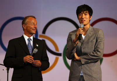 China's Olympic 110m hurdles champion Liu Xiang (R) answers questions from International Olympic Committee IOC officials at a dinner given by IOC President Jacques Rogge to entertain the official sponsors for the Beijing 2008 Olympics at Beijing Hotel August 7, 2007. [Xinhua]
