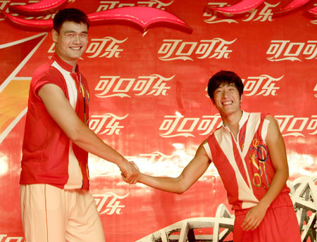 China's NBA super star Yao Ming (left) and Olympic 110m hurdles champion Liu Xiang shake hands during the launching ceremony of the plan for one-year countdown to Beijing Olympics celebration in Beijing August 8, 2007. [Xinhua]
