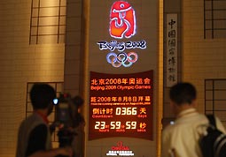 Journalists look at the 2008 Beijing Olympic one-year countdown clock near Tiananmen Square in Beijing August 7, 2007. [Reuters]