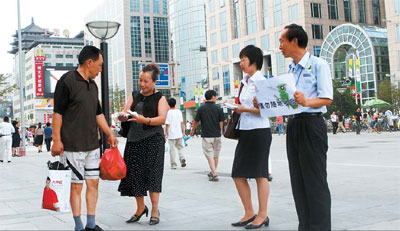 Wang Tao, an anti-spitting activist, and volunteers offer passers-by at Wangfujing pieces of tissue to reduce spitting on the street.