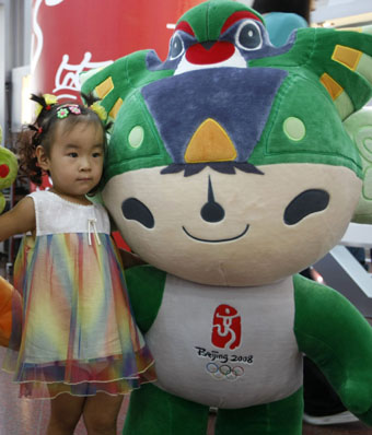 A child poses for a photo with an official mascot soft toy of the Beijing 2008 Olympic Games at an Olympic flagship store in Beijing, August 7, 2007. The Chinese capital is gearing up to celebrate the one-year countdown to the opening ceremony of the 2008 Olympic Games on August 8. [Reuters]