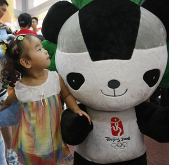 A child plays with an official mascot soft toy of the Beijing 2008 Olympic Games at an Olympic flagship store in Beijing, August 7, 2007. The Chinese capital is gearing up to celebrate the one-year countdown to the opening ceremony of the 2008 Olympic Games on August 8. [Reuters]