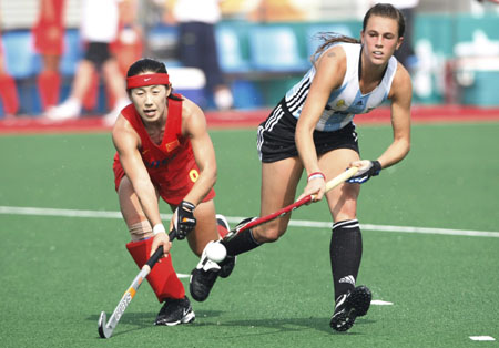 Argentina'sRebecchi (R) and China'sLi Shuang battle for the ball in the women'sfield hockey match at the Good Luck Beijing 2007 International Hockey Tournament in Beijing, August 8, 2007. China beat Argentina 3-0 to win the match. [Reuters]